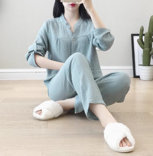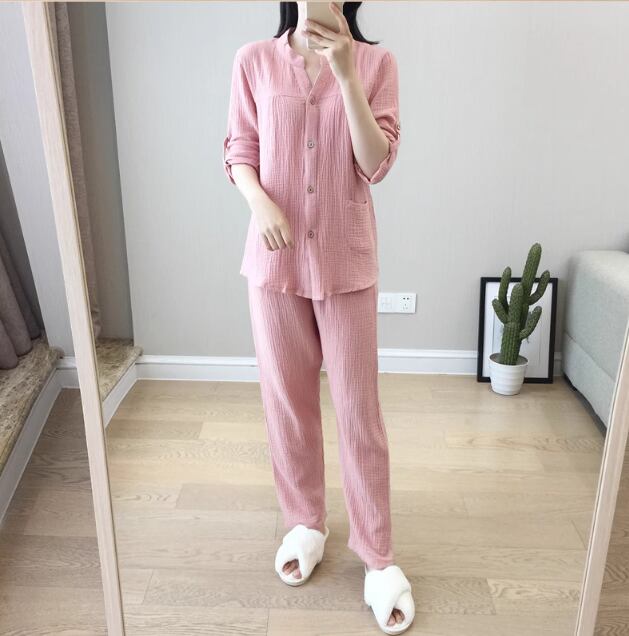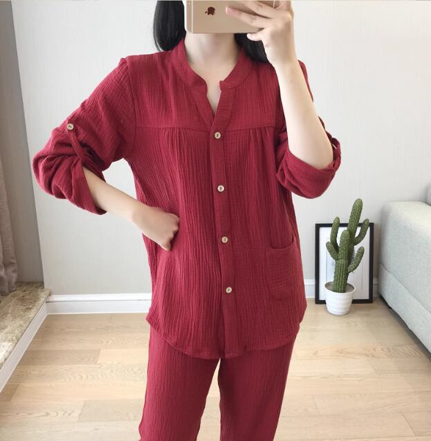 パジャマ 部屋着 寝巻き ナイトウェア ロング ロング丈 長袖 Vネック ウエストゴム ボタン 綿 薄手 コットン ガーゼ 上下セット ツーピース かわいい きれいめ シンプル カジュアル 大人 上品 おしゃれ お洒落 大人可愛い 大人女子 ラフ ラブリー キュート 無地 春 夏 秋 冬 10代 20代 30代 40代 レディース 女性用 お泊まり 休日 韓国 韓国系 楽ちん 体系カバー お腹カバー サイズ M L XL 色展開 赤 レッド 緑 ピンク 水色 ライトピンク ダークレッド ダークグリーン | Reluci