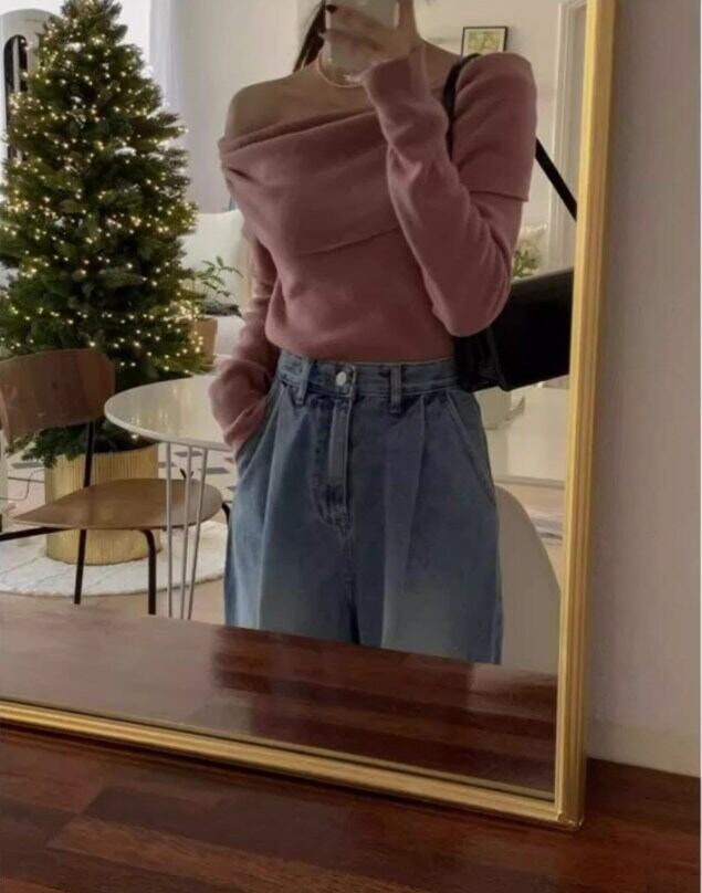 胸元の折り返しデザインのボリューム感が魅力のオフショルダーニットです。