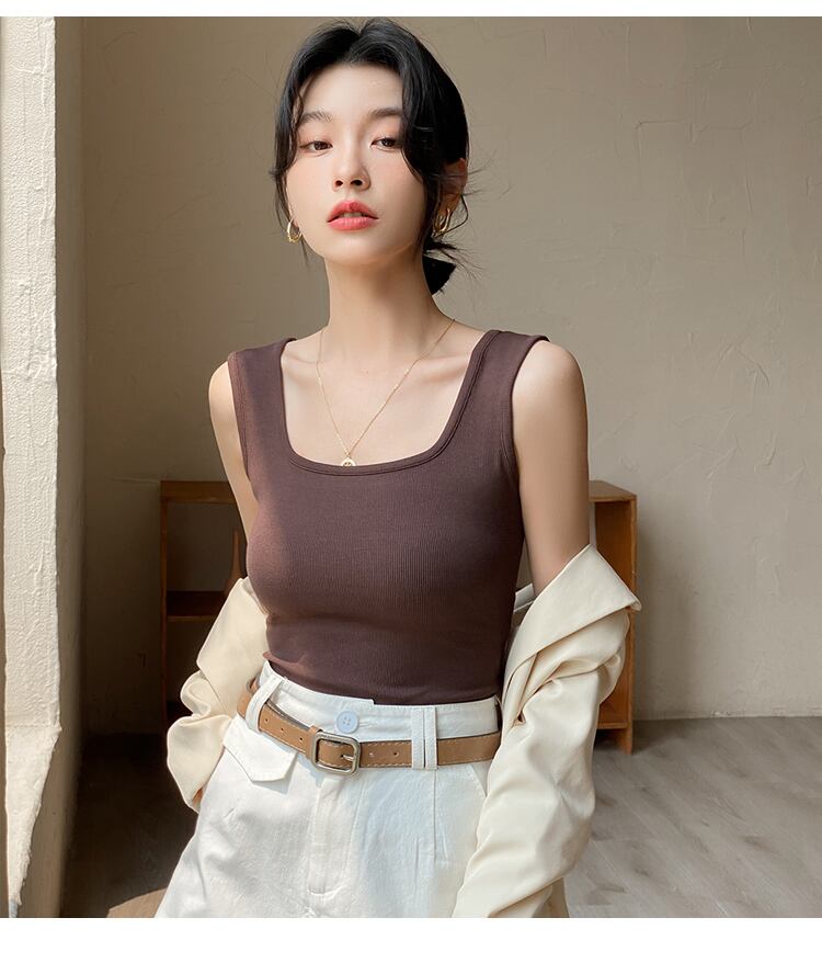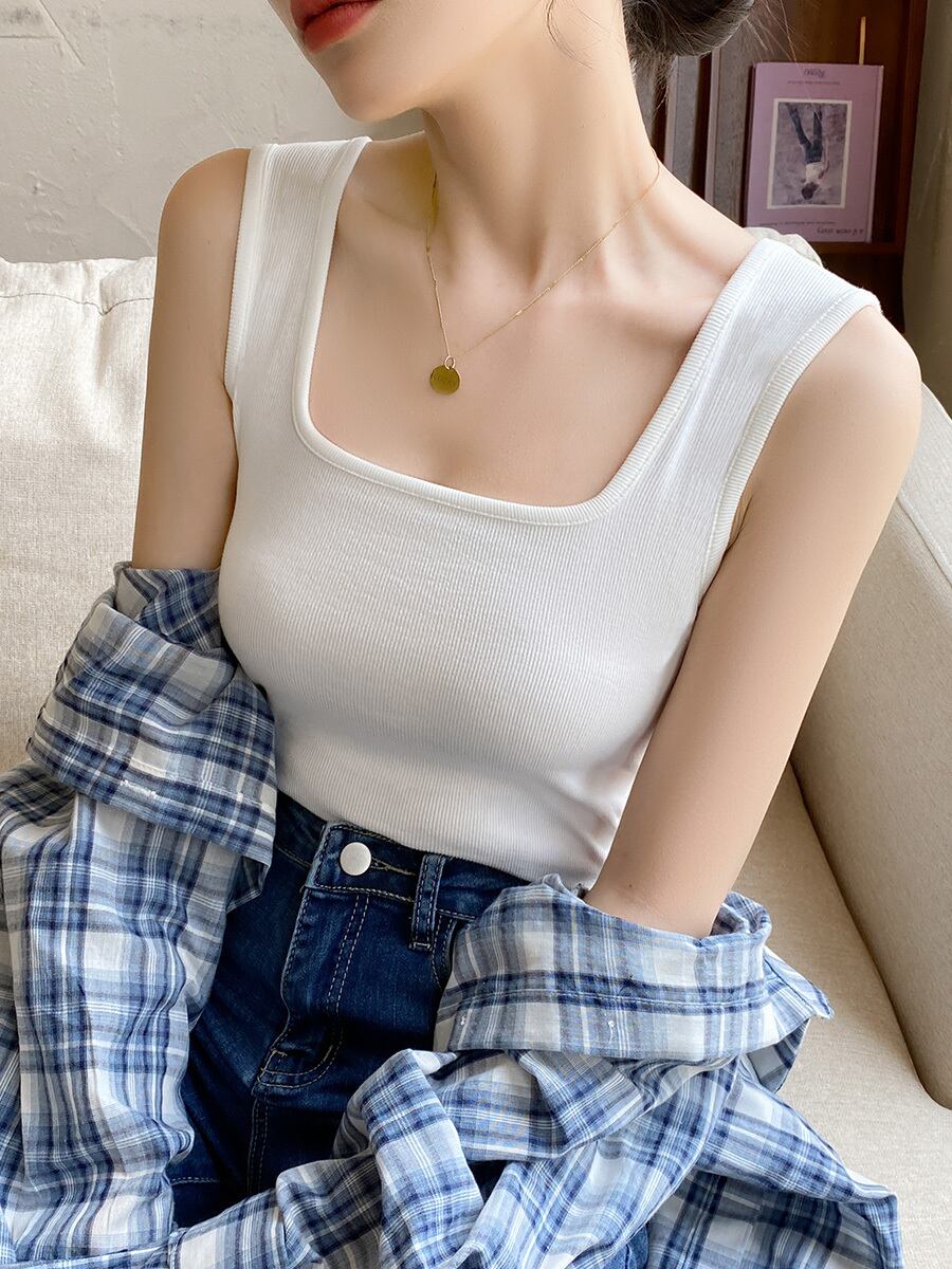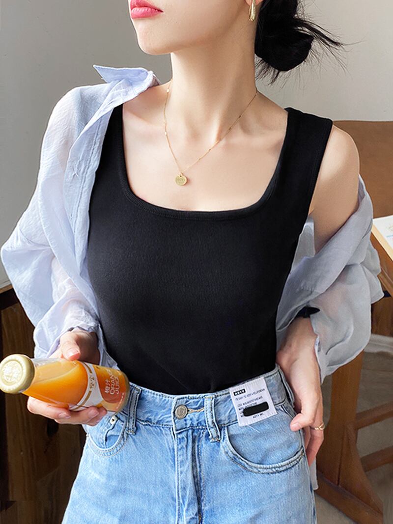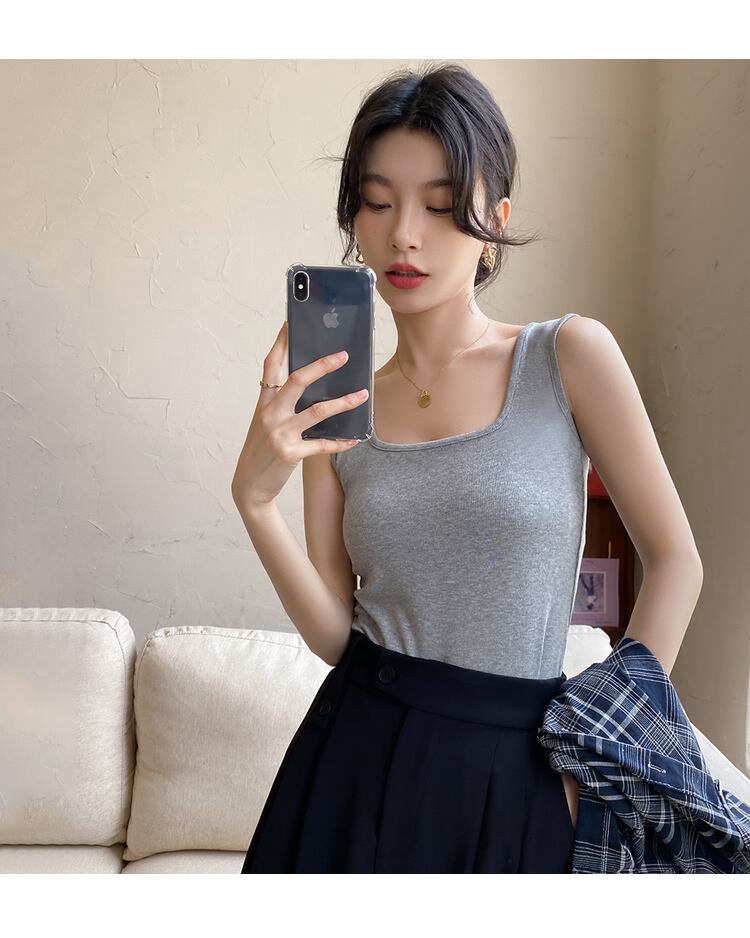 この袖なしのタンクトップは、スクエアネックデザインが特徴で、女性らしさを引き立てつつ、シンプルな美しさを兼ね備えています。