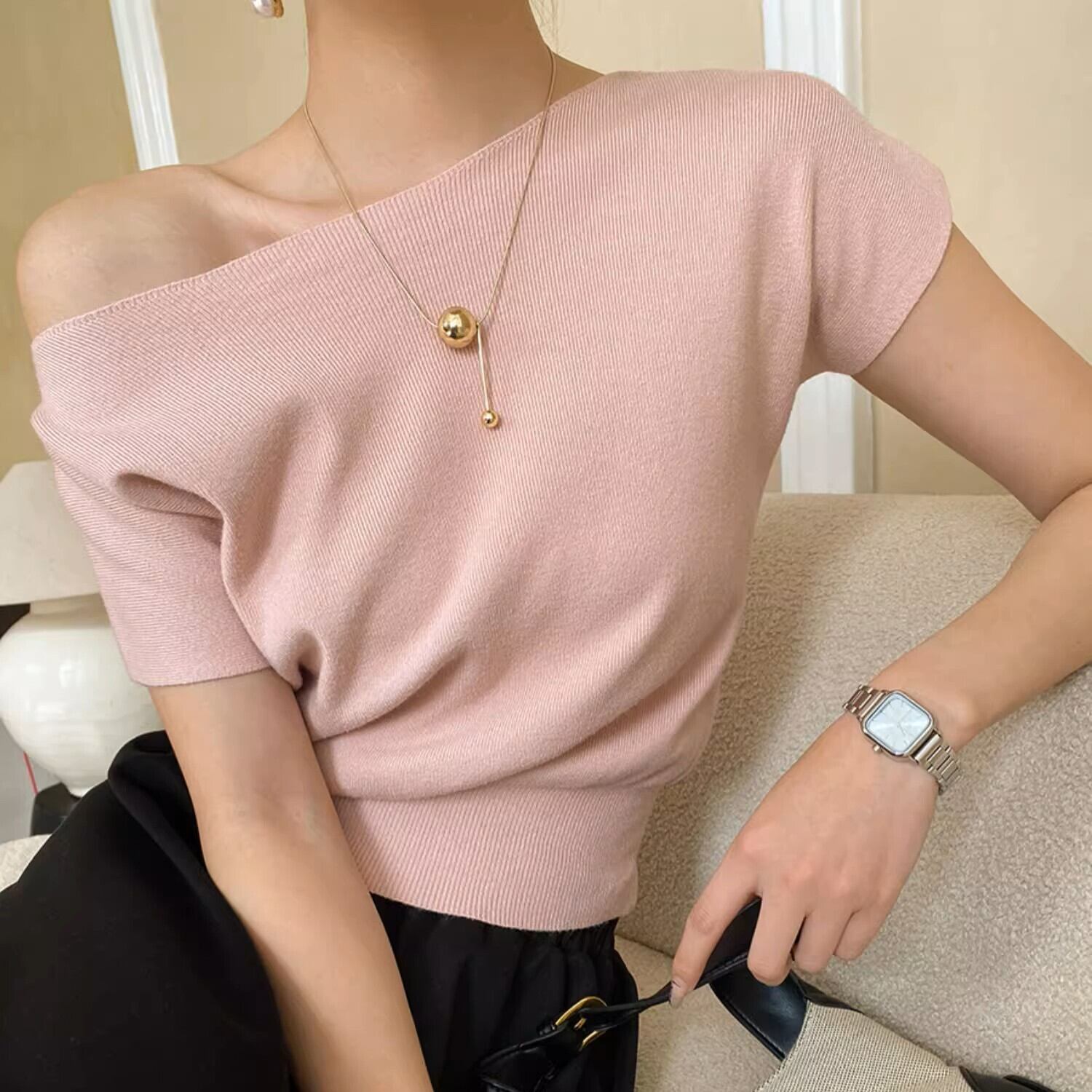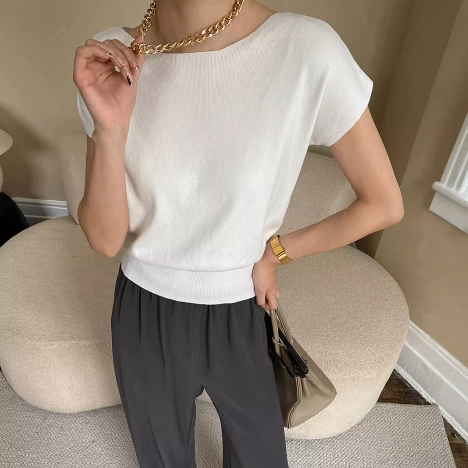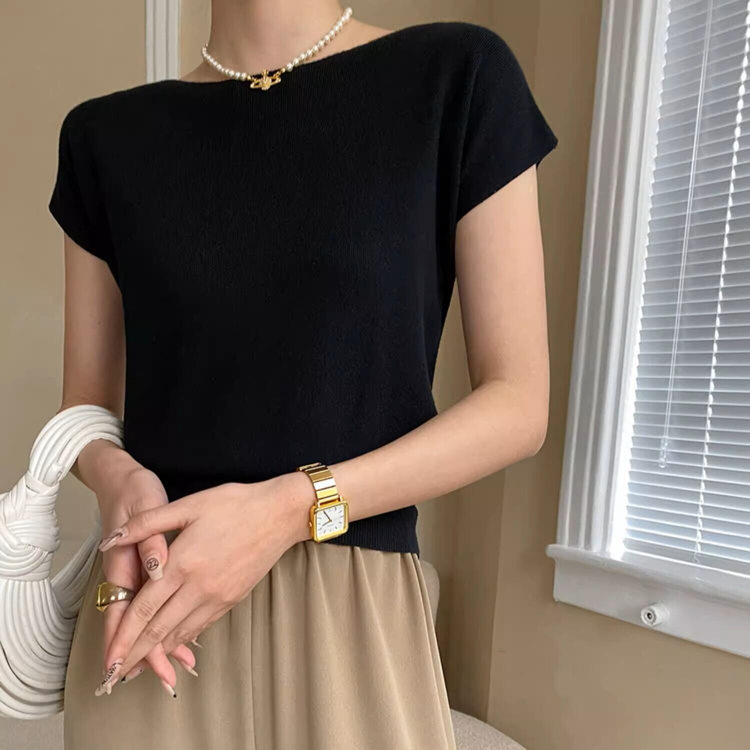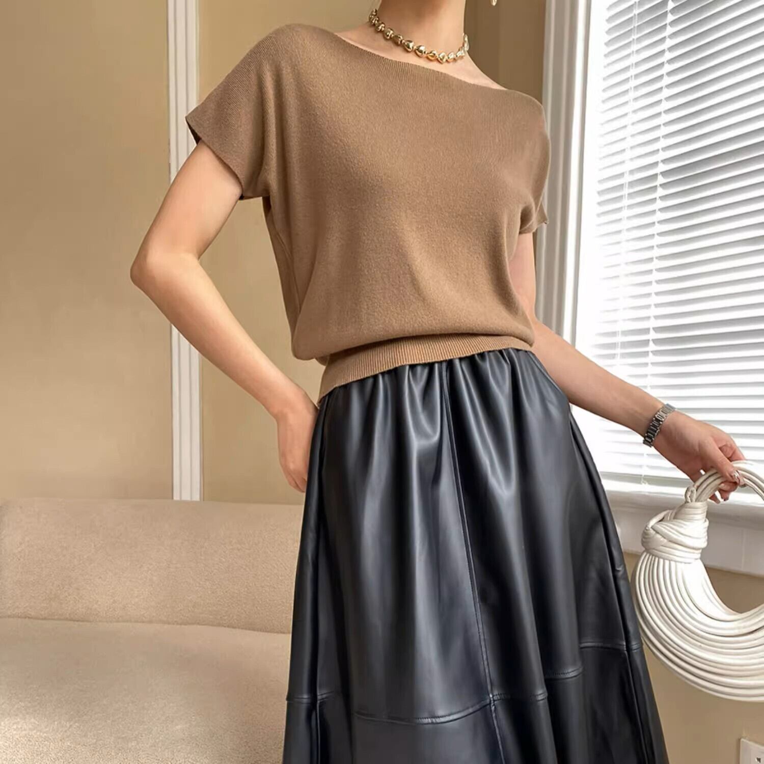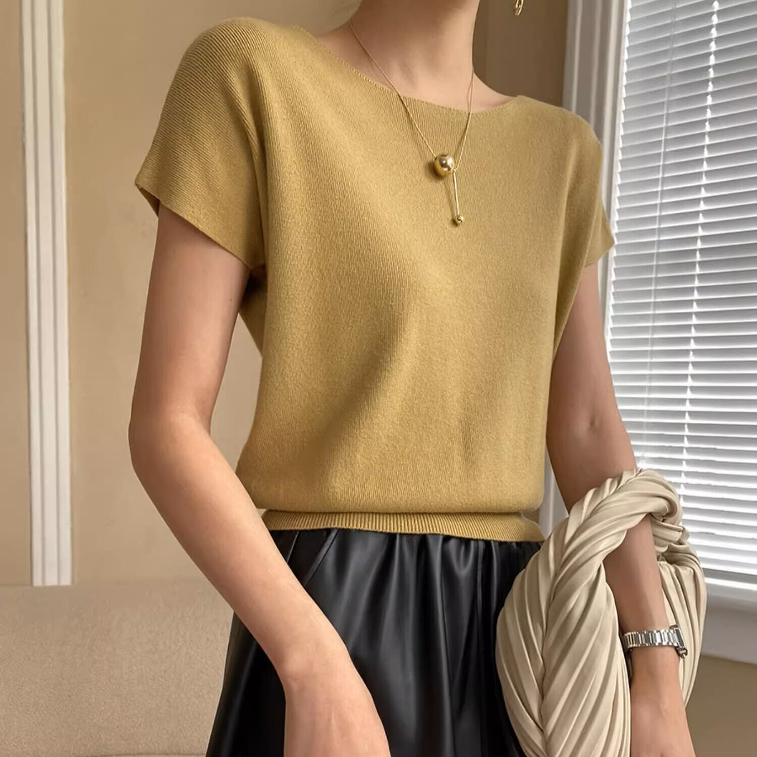 薄手で伸縮性があり、どんなボトムスとも合わせることができる1枚で、様々なシーンで着回しのできる上品な1枚です。