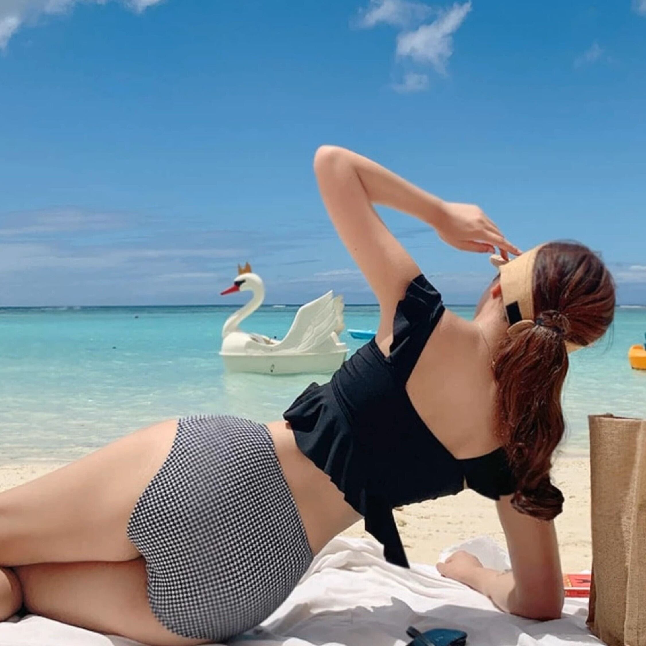 水着 ビキニ スイムウェア レディース セパレート フリルショルダー フリル ウエストマーク ハイウエスト 伸縮性 セット ツーピース 上下セット かわいい 大人可愛い きれいめ カジュアル ナチュラル 華やか 大人っぽい おしゃれ お洒落 レトロ 主役級 存在感 ラブリー キュート ガーリー 個性的 モード系 モダン エキゾチック セクシー フェミニン ヘルシー チェック リゾート 旅行 プール 夏 海 美脚 脚長 スタイルアップ 高見え 格上げ モテ インスタ映え こなれ感 M L XL ブラック | Reluci