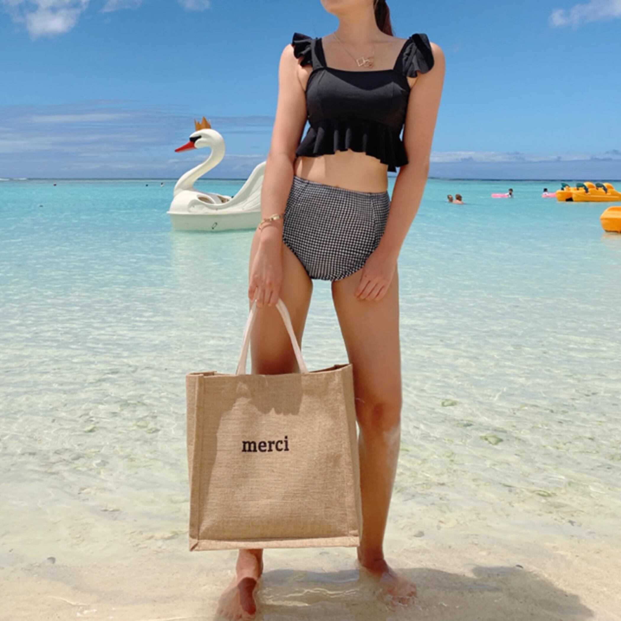 ハイウエストのデザインと肩や裾のフリルがお洒落でかわいいビキニです。