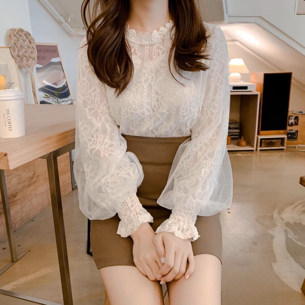 全体が繊細なレースで、ふんわりとボリュームのある袖がお洒落なシルエットの長袖トップスです。
