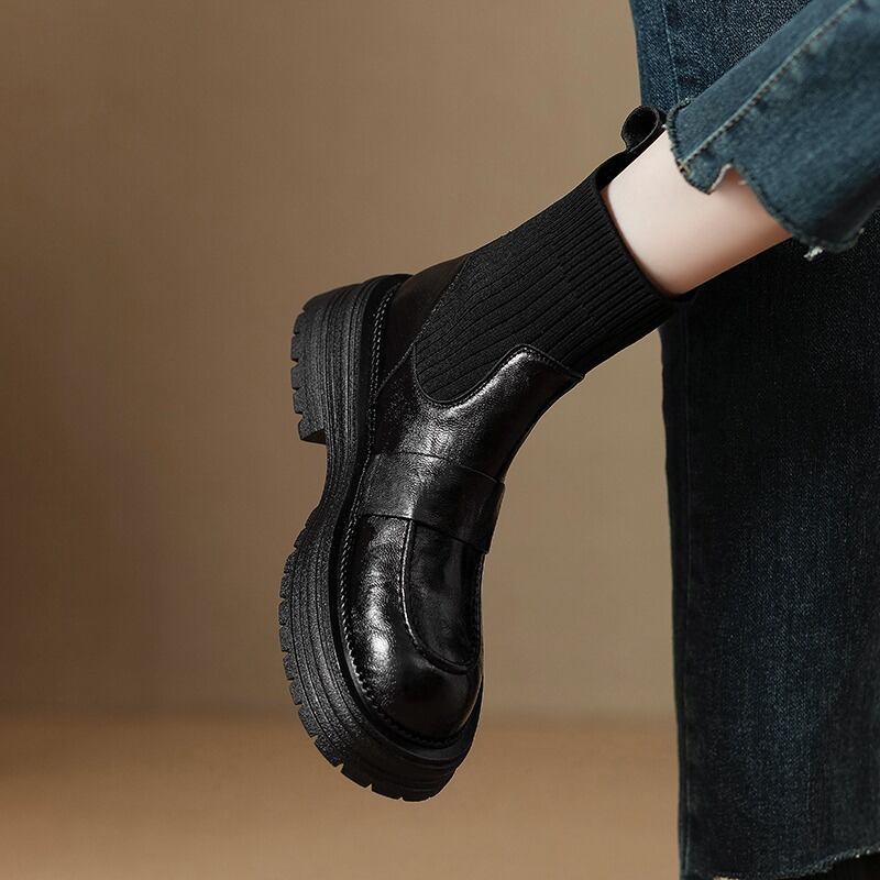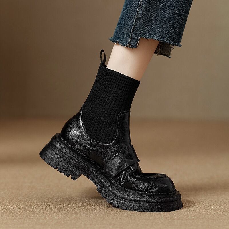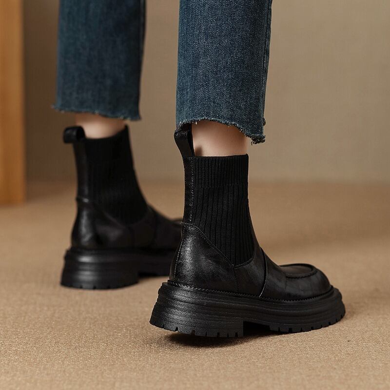 ブーツ レディース ボリューム ショートブーツ ソックスブーツ 5cm ローヒール ラウンドトゥ 革 レザー かわいい 大人可愛い シンプル カジュアル 上品 おしゃれ かっこいい ラブリー キュート ガーリー ラフ 存在感 こなれ感 スタイリッシュ 無地 春 秋 ロングシーズン デート お出かけ 旅行 休日 ショッピング 女子会 ランチ カフェ デイリー 普段使い コーデ スタイル 着回し 22.5cm 23.0cm 23.5cm 24.0cm 24.5cm 25.0cm 小さいサイズ 黒 ブラック | Reluci