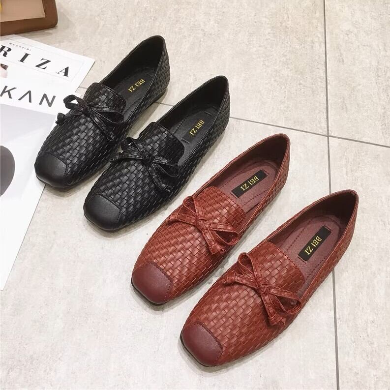 編まれたような素材とリボンがガーリーで大人可愛いフラットシューズです。
