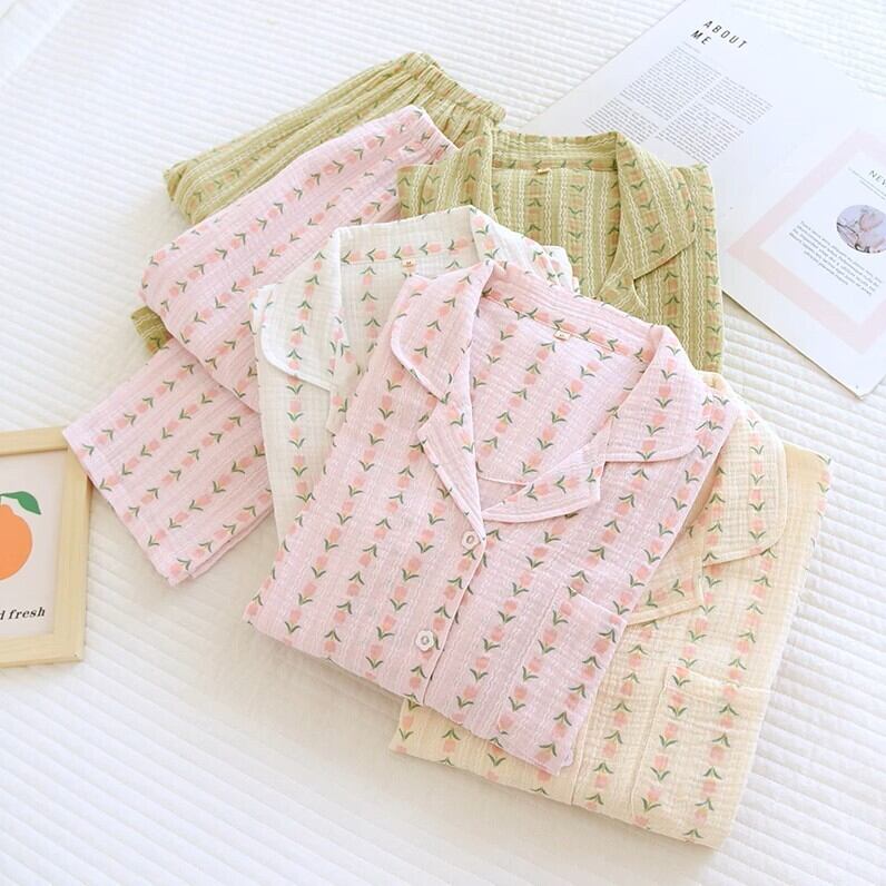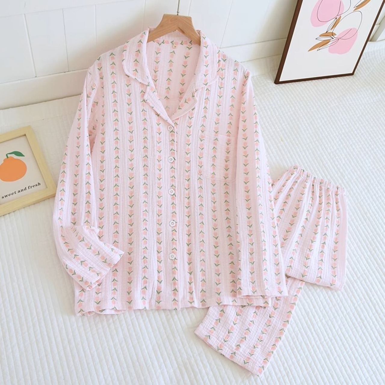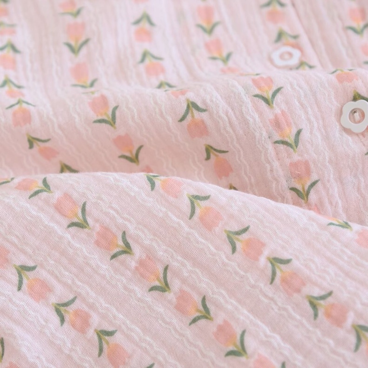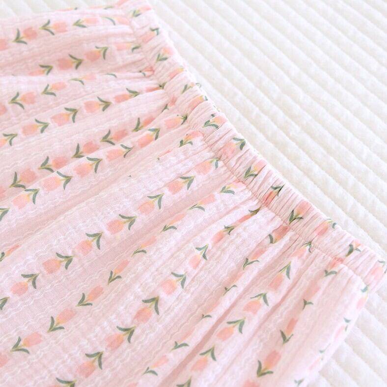 並んだチューリップがレトロで大人可愛い、休日や旅行など様々なシーンで活躍する上下セットです。