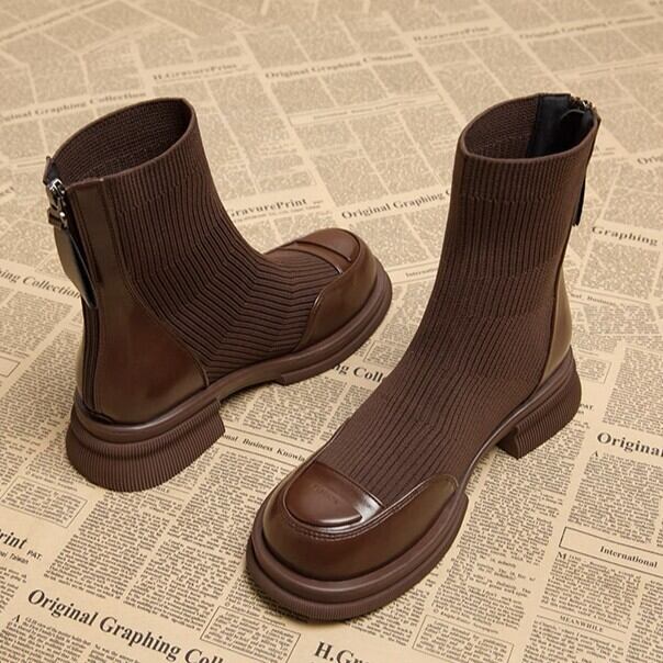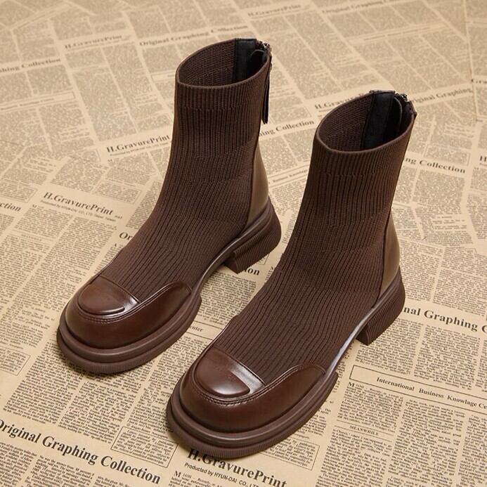 リブ素材とレザーが合わさったデザインが大人可愛く、すっきりとしたシルエットのブーツです。