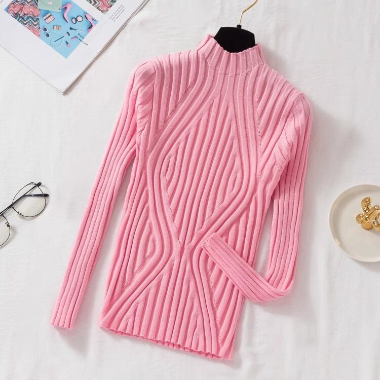 細身のシルエットが女性らしさを引き立て、ハーフタートルネックデザインが上品な雰囲気を演出します。