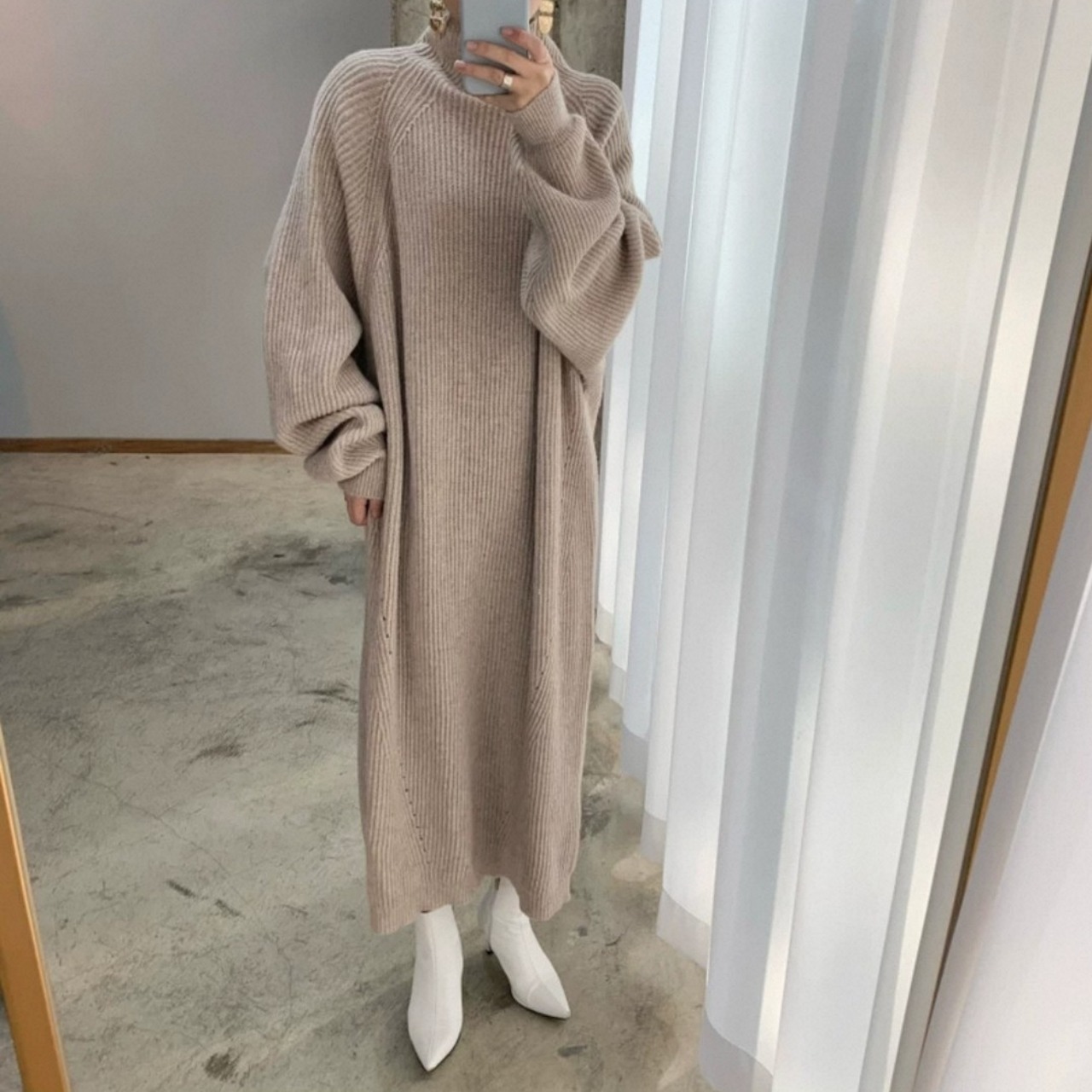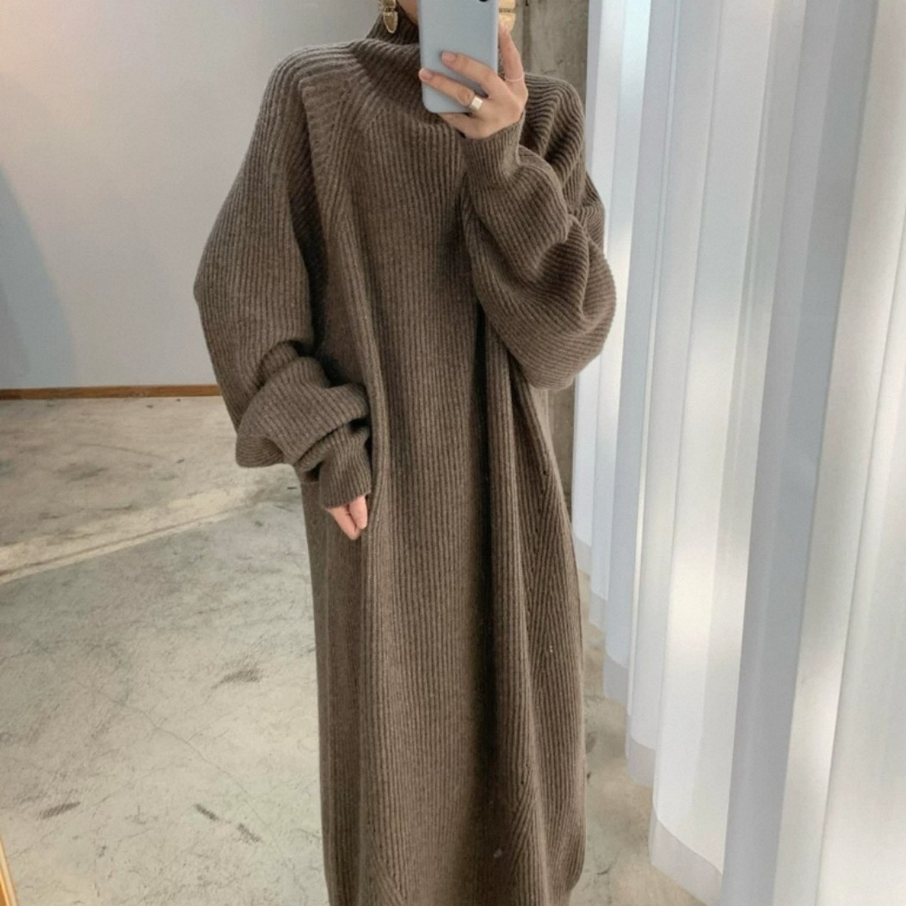 ゆったりしたシルエットが魅力のルーズカジュアルなニットワンピース。ハイネックのディテールが秋冬らしい暖かみを添え、1枚でコーデが完成する万能アイテム。ニッチなデザインが差をつける大人の韓国ファッションに。