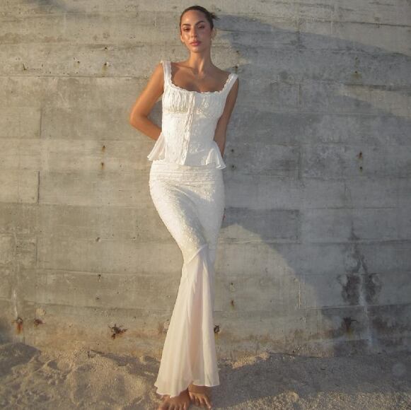 タイトなペンシルスカートと、ボートネックのタンクトップが組み合わせられたこのセットは、フェミニンでありつつもクールな印象を与えます。バックスリットやファスナー付きのディテールが、都会的でラグジュアリーな雰囲気を演出。デートやお出かけ、パーティーやイベントにもぴったりの一着です!