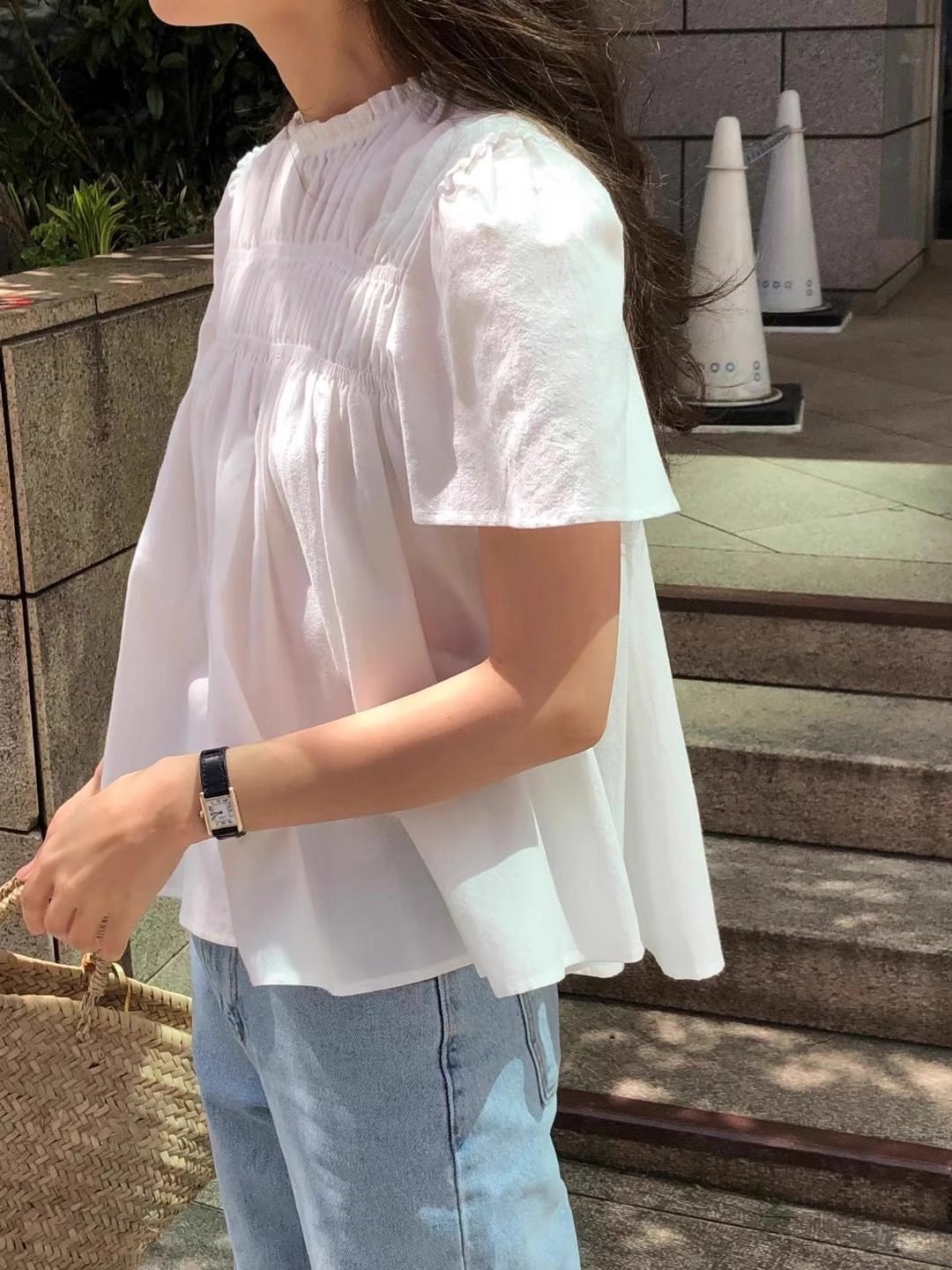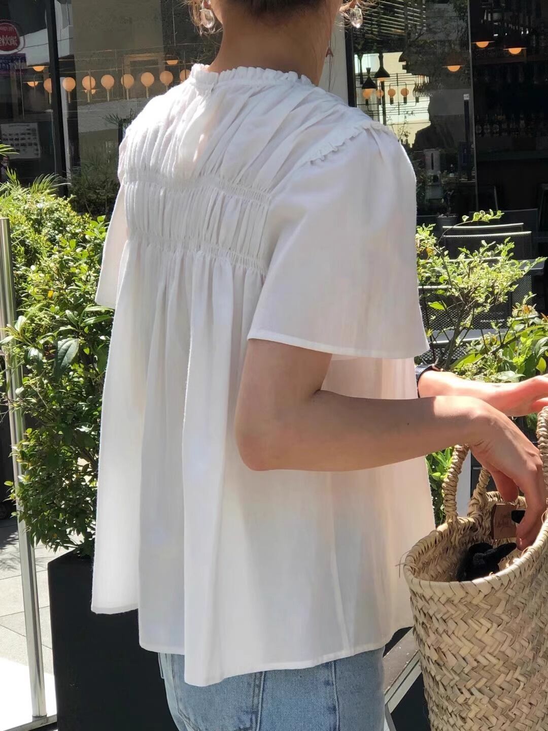 この半袖シャツは、ボリューム袖とパフスリーブが特徴で、シンプルながらもフェミニンな魅力を引き立てます。