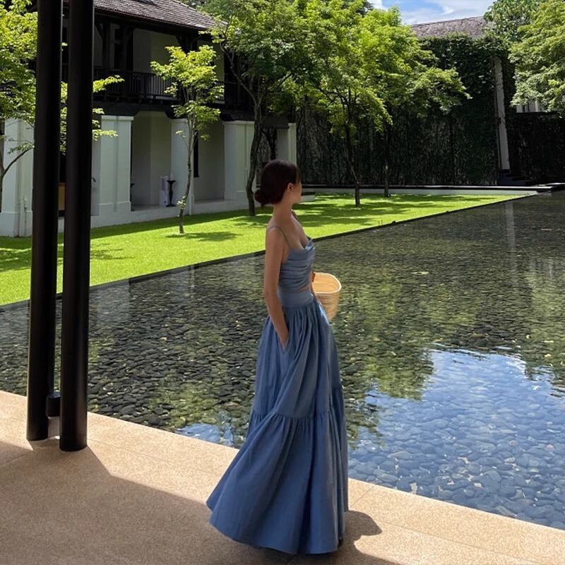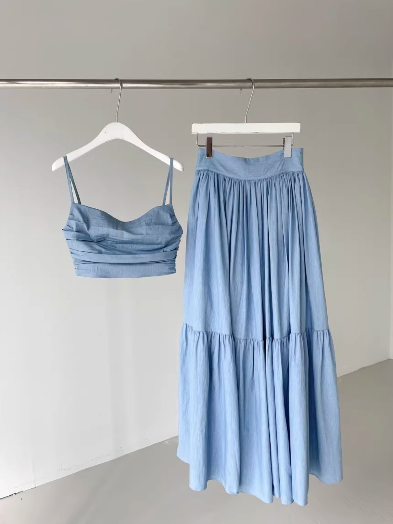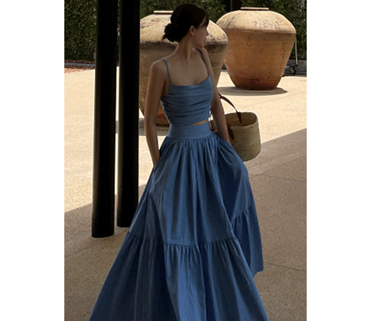 トップス スカート セットアップ キャミソール Vネック 袖なし ノースリーブ スカート ロング ロング丈 フレア ハイウエスト スリム 細身 かわいい 大人可愛い シンプル カジュアル 大人 おしゃれ お洒落 無地 春 夏 入学式 卒業式 10代 20代 レディース 女性用 学生 通学 デート お出かけ 女子会 休日 韓国 韓国系 オルチャン ファッション コーデ 美脚 脚長 インスタ映え サイズ S M L 青 ブルー 大人カラー 定番カラー | Reluci
