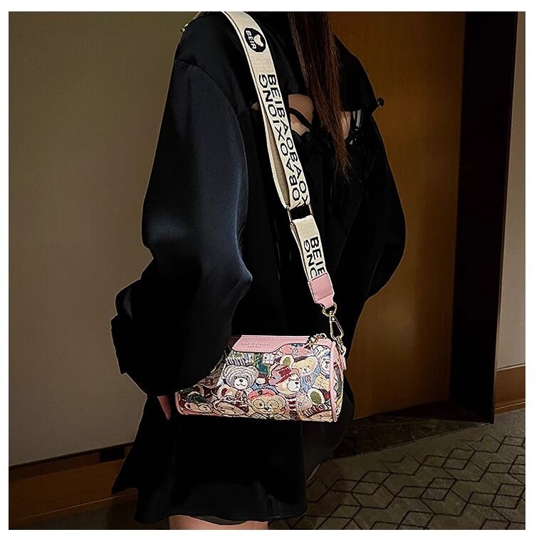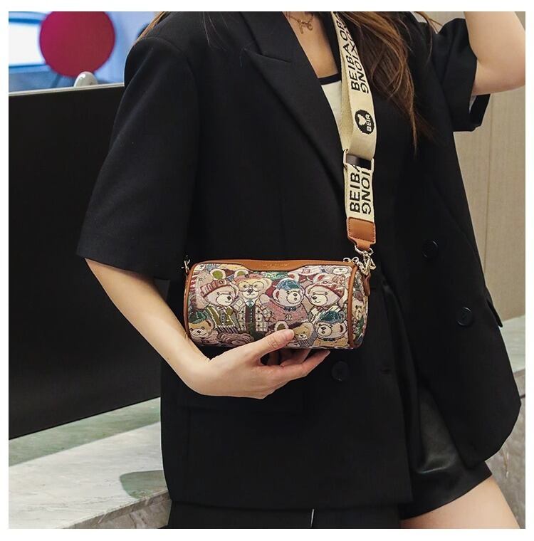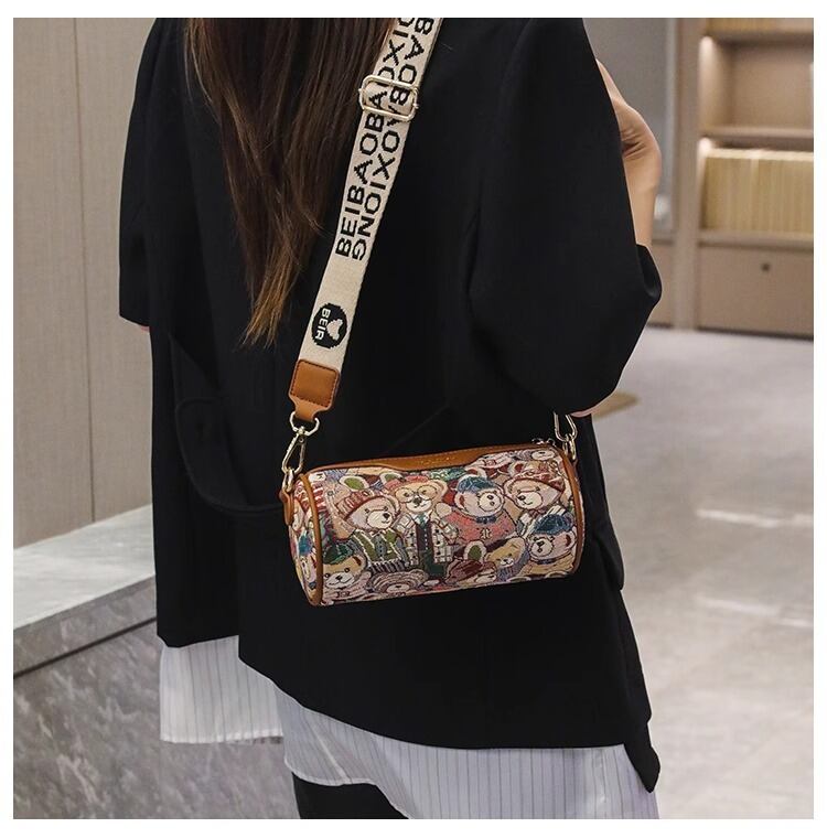 ショルダーバッグ バッグ レディース 肩がけ 円筒 ファスナー かわいい 大人可愛い お洒落 レトロ こなれ感 ラブリー キュート 主役級 存在感 個性的 クラシック くま 総柄 デート お出かけ イベント リゾート お買い物 女子会 休日 ランチ会 レストラン 普段使い コーデ スタイル モテ 甘めコーデ 春 夏 秋 冬 シーズンレス お食事会 ピンク ブラウン ネイビーブルー 定番カラー | Reluci