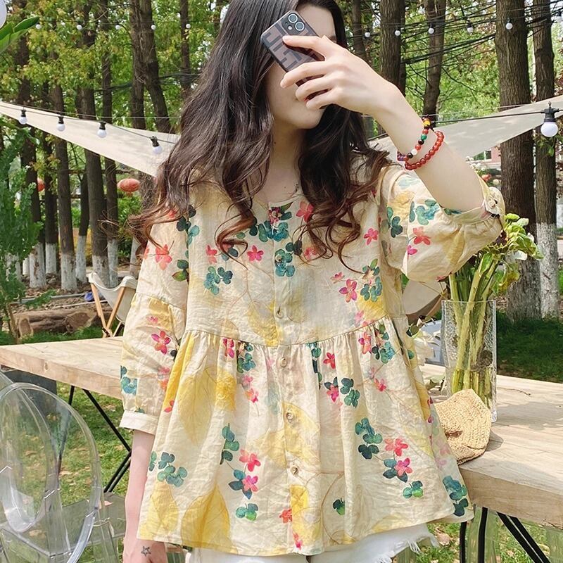 トップス シャツ ブラウス 袖あり 7分袖 七分袖 ラウンドネック シフォン フリル かわいい 大人可愛い きれいめ 大人 上品 おしゃれ お洒落 レトロ アジアン 大人可愛い 大人女子 個性的 クール モード系 エレガント モダン 柄 花柄 春 夏 20代 30代 40代 レディース 女性用 通勤 デート お出かけ 女子会 休日 パーティー セレブ 高見えイベント 着回し 普段使い 韓国 韓国系 オルチャン 体系カバー S M L XL 大人カラー イエロー | Reluci
