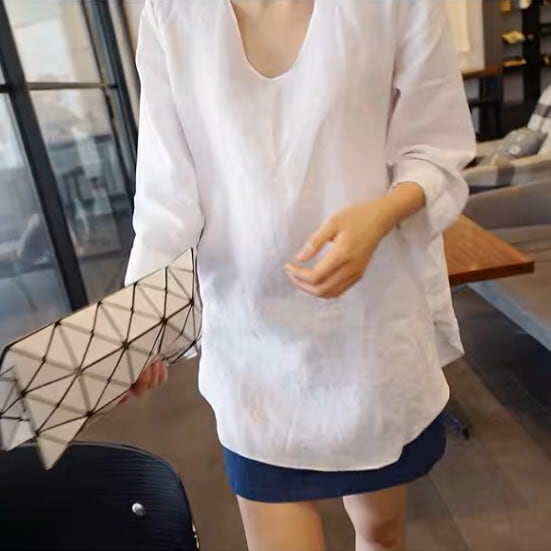 Vネックですっきりとしたシルエットで、ロングシーズン着回しの楽しめる7分袖トップスです。