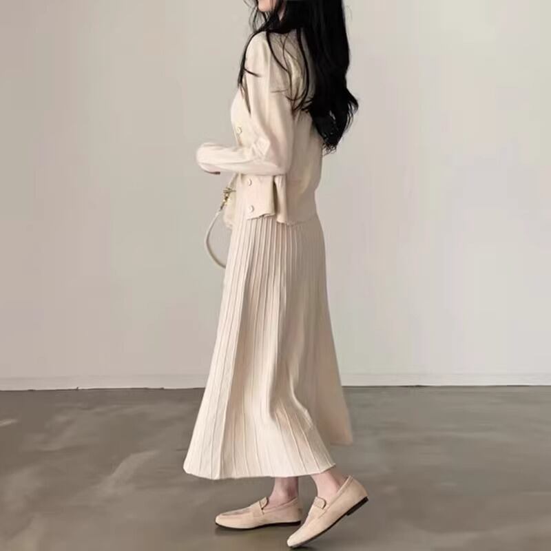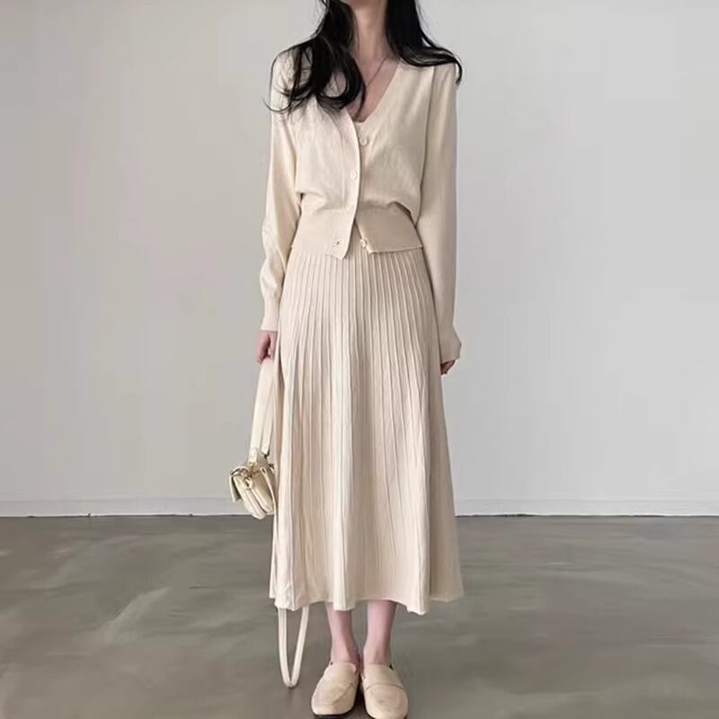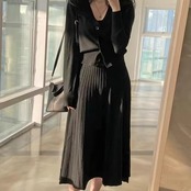 上品で大人可愛い2色選択のセットアップが登場しました!シンプルで清潔感のあるデザインながら、女性らしさを引き立てるカーディガンとキャミソールワンピースのセット。