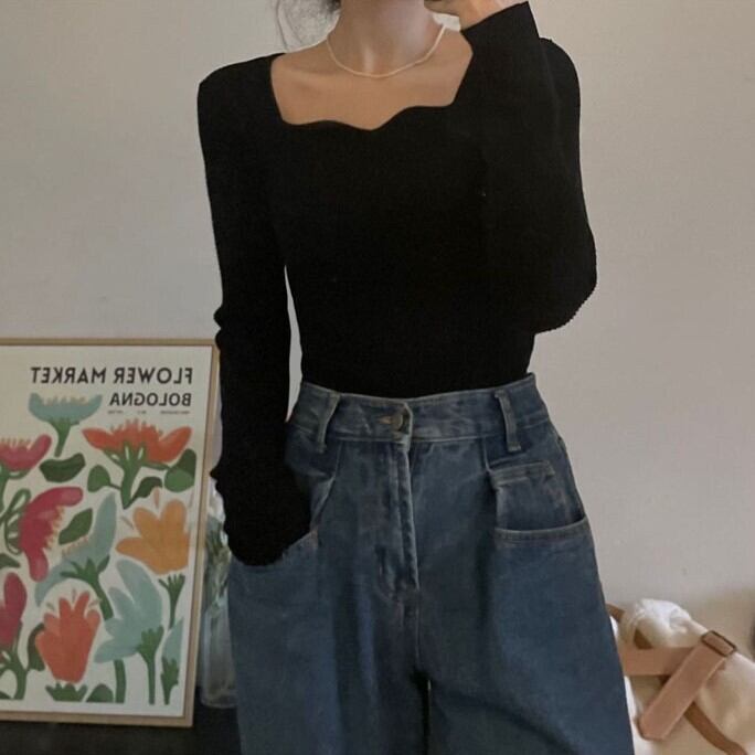 洗練されたフレンチスクエアネックが特徴的な、大人可愛いリブニットカットソー。