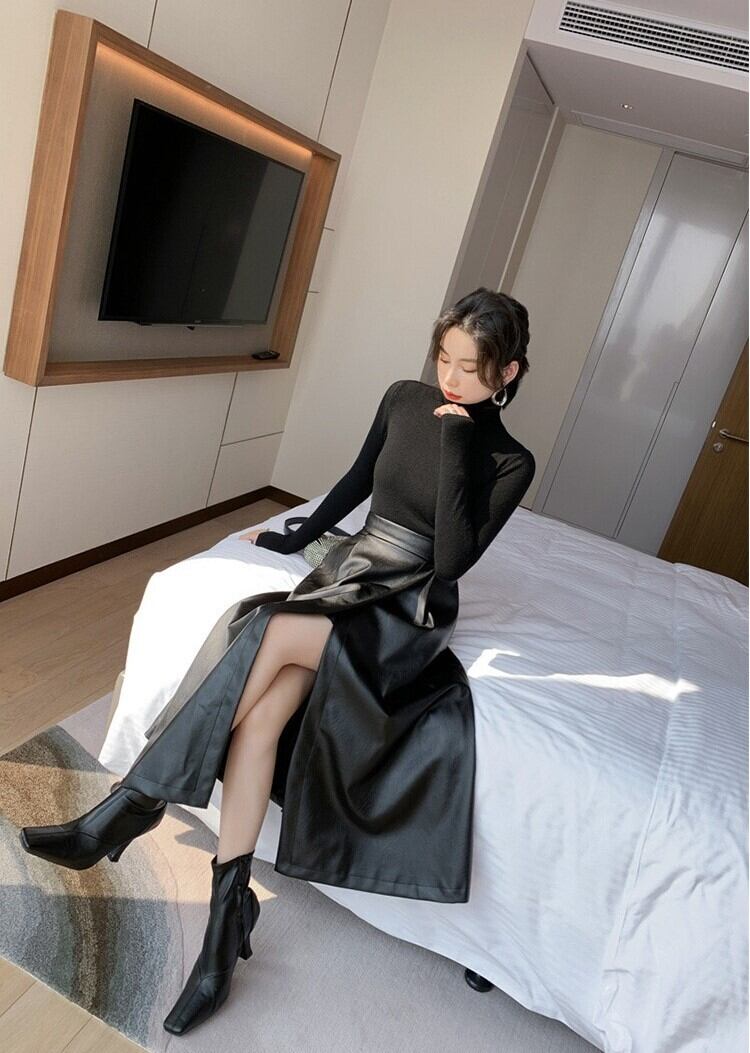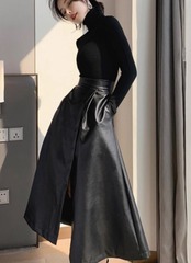 レザーのハードさと、ふんわりとしたフレアなシルエットが絶妙に融合したミモレ丈で、どんなシーンにも映えるアイテムです。